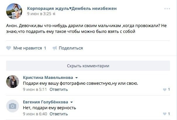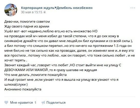 Двигаемся дальше по стене – мудрая ждуля советует всем ждать своих мужчин, потому что им очень приятно, когда их «любят блиские», так что «верте, любите!» Моё любопытство сменяется состраданием к парням, которым придется возвращаться к этим леди. Да, такая надует именные шарики на Дембель, выложит в инстаграм 50 фотографий тебя и купит новый кружевной лифчик, когда приедет встречать на вокзал с первыми птицами. Но всё, что её волнует, – не бросишь ли ты её, долго ли ей быть одной, как за это время похудеть и сколько положено плакать порядочной ждуле после проводов парня.
