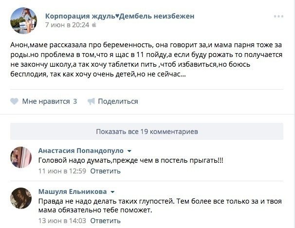 Семнадцатилетняя участница сообщества забеременела и спрашивает у остальных, что делать. Мир ждуль треснул надвое: одни считают, что «головой думать надо было», другие делятся опытом родов в подростковом возрасте: «Господи, я родила в 16, на 1 курсе колледжа, вышла, в академ, не знаю зачем нужна помощь, мне помогают конечно, но не сказать, что слишком, сама справляюсь, живу одна, мужа с армии жду))) и все хорошо, продолжу учебу как она в сад пойдет, дочь это лучший человек в моей жизни!!!»