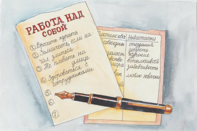 Ну вот, список готов. Теперь кладём рядом ещё один лист и пишем заголовок «Работа над собой». Ниже нужно записать качества, которые необходимо приобрести, изменить или избавиться. Например, «бросить курить», «не плевать на улице», «здороваться с сотрудниками», «замолчать, если начал злиться» и тому подобное. Это ваши пожелания себе. Их будет трудно добиться, но помнить необходимо, поэтому этот лист будет висеть у вас в комнате на видном месте.
