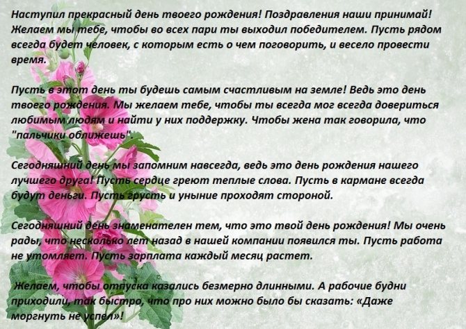 Тебе в день рожденья хочу пожелать Улыбки дарить и от счастья сиять, Удачи вагон и везенья мешок, Желаю, чтоб полным был твой кошелек, Хорошего босса и дружных коллег Здоровья тебе и всем близким навек!