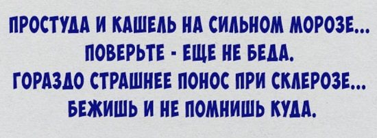 Куда идешь? Иду к врачу. И что несешь? Свою мочу. А ты куда идешь, чудак? И я к врачу, несу коньяк. Себя вопросом озадачь, Кому скорей поможет врач.