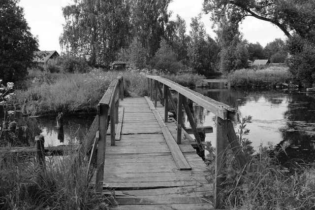 Через небольшие речки – несколько жёрдочек, бревнышко, редко – прочный железный мосточек. Мостиком через ручей чаще всего служили длинные доски, они же настил в сырых, топких местах. Если речка была пошире, то у мостика старались сделать перильца хотя бы с одной стороны… помню ощущение шаткости под ногами: идёшь, а он раскачивается даже под твоим невеликим весом.